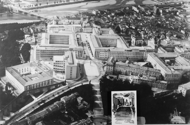 Vista aérea da Cidade Universitária de Coimbra com colagem de desenho de Cottinelli Telmo. Exposição “Os anos 40 na arte portuguesa”, 1982. Foto de Mário Novais, 1982. Fonte: Biblioteca de Arte da Fundação Calouste Gulbenkian.